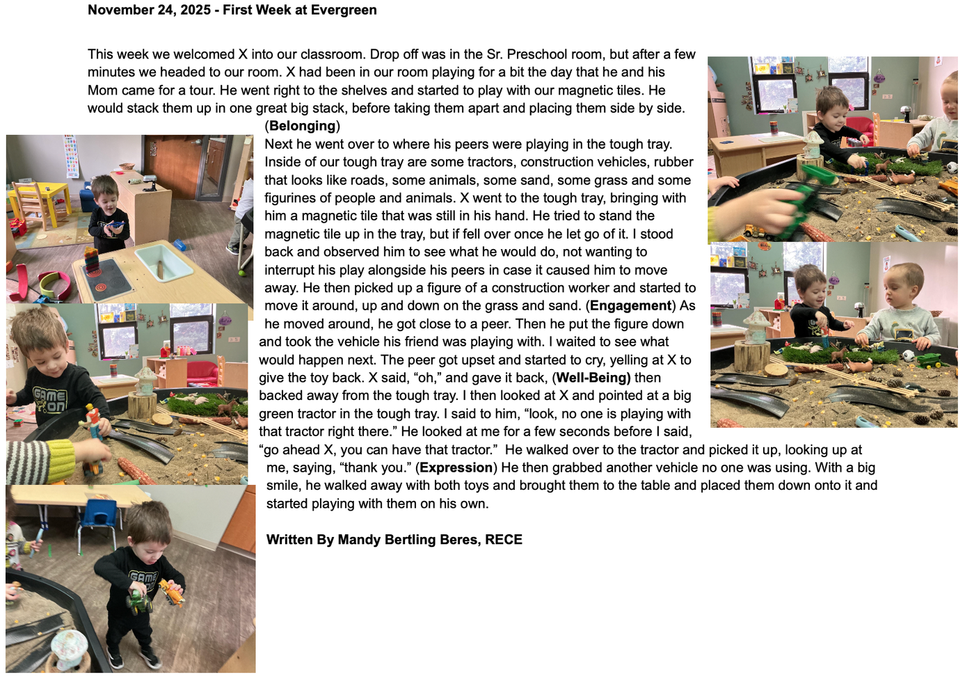 Well-being: He showed excitement and confidence while playing by expressing his ideas to the peers and the educator, giggling and smiling at people around him. He knows the boundary of the playing area and keeps himself in the classroom.