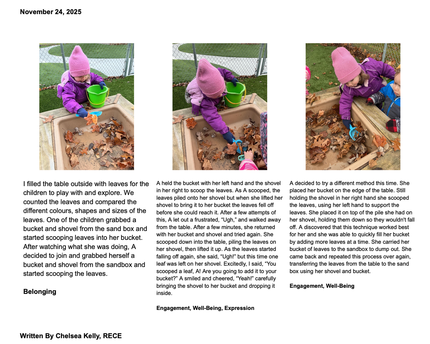 Well-Being: M used her fine motor skills as she poured water into the green cup. When the scoop didn’t work, she showed her competency when she came up with a solution that worked great.